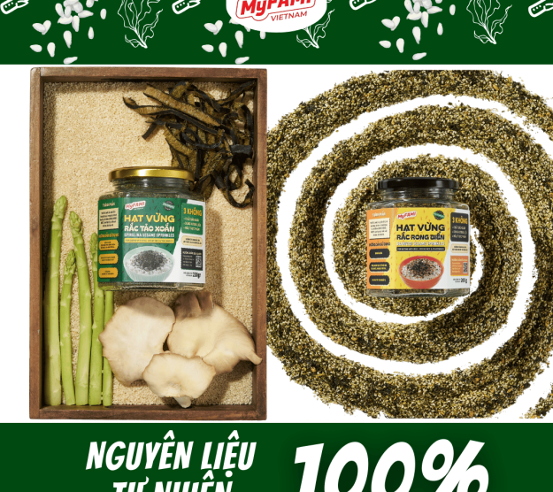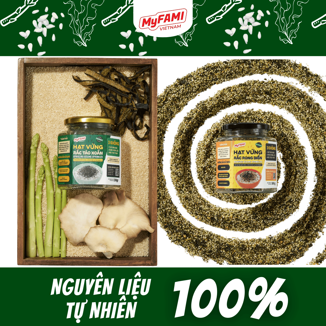 Với 100% nguyên liệu tự nhiên: mè trắng, rong biển, tảo xoắn, rau củ, thịt tôm biển, Hạt Vừng Rắc không chỉ ngon miệng mà còn bổ sung thêm protein, chất xơ và khoáng chất thiết yếu cho cơ thể.