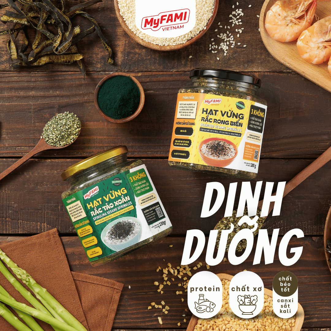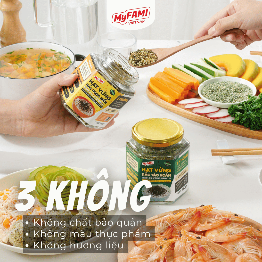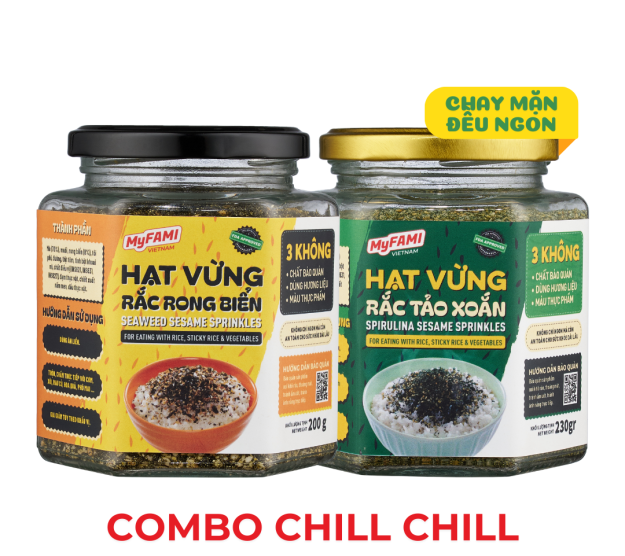 Combo Chill Chill bao gồm 2 sản phảm: Hạt Vừng Rắc Rong BiểnHạt Vừng Rắc Tảo Xoắn – lần đầu tiên có mặt tại Việt Nam! Sản phẩm Hạt Rắc Ăn Liền độc đáo, tiện lợi và giàu dinh dưỡng mà MyFAMI mang đến cho người tiêu dùng hiện đại.